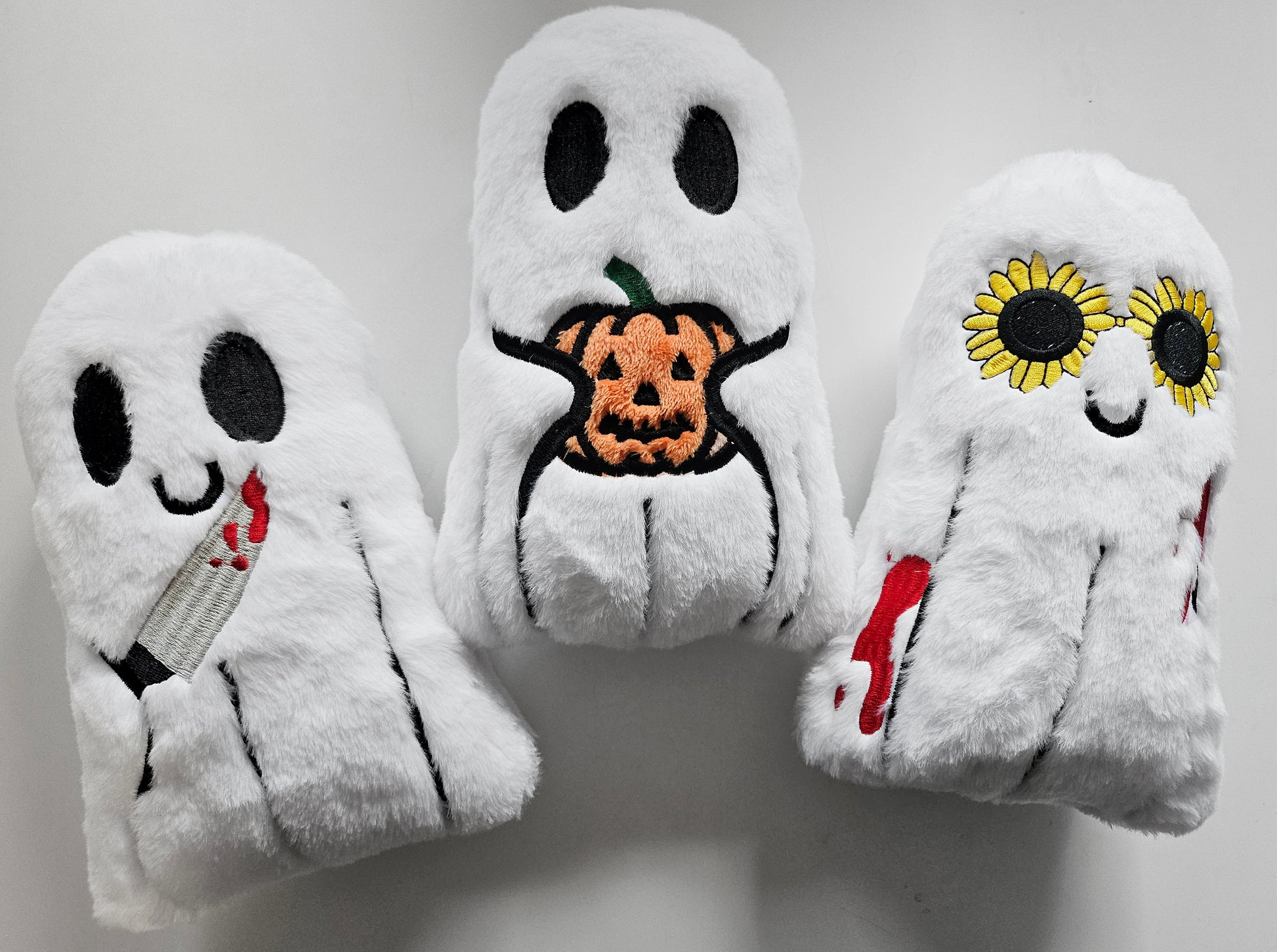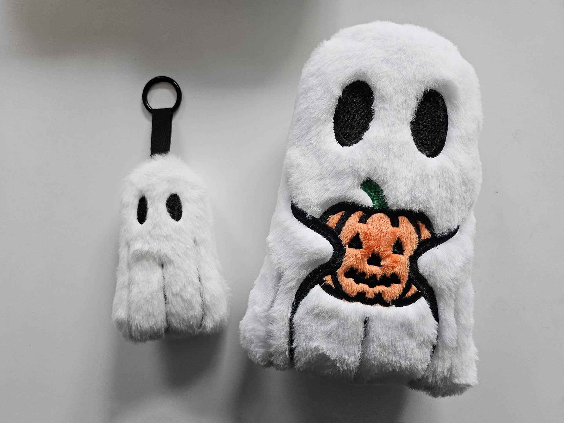 His sheet is made from 100% Polyester faux fur (hes an extremely soft and fluffy ghostie!), all his features are embroidered and then finished by hand to stitch him up!